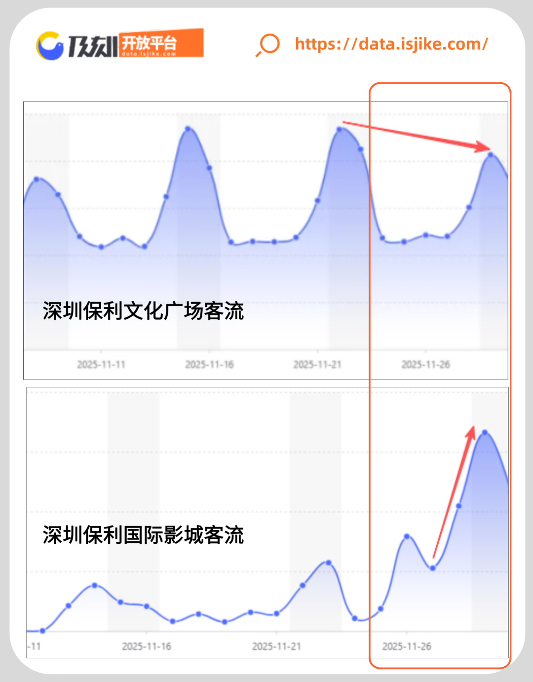 在传统商业逻辑中,影院被视为购物中心的“客流引擎”,能够自然带动餐饮、零售等消费。然而,根据我们对大量购物中心的实时客流监测数据显示,很多地区商场整体客流并未随影院客流一同走高,反而呈现出与往常无异的客流曲线,甚至最高客流峰值环比有所下降。