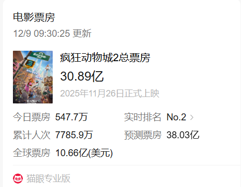 近期,《疯狂动物城2》的热度席卷全国。截至12月9日,其内地票房已突破30亿元,位列2025年内地年度票房榜第三。在多座城市,影院客流显著上升,座位利用率和黄金场排片均大幅提升,这无疑是线下娱乐消费复苏的积极信号。